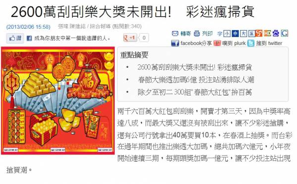 討論版列表 » 刮刮樂討論版 » [分享] (02-07) 2600萬大獎尚未開出.彩迷瘋掃貨