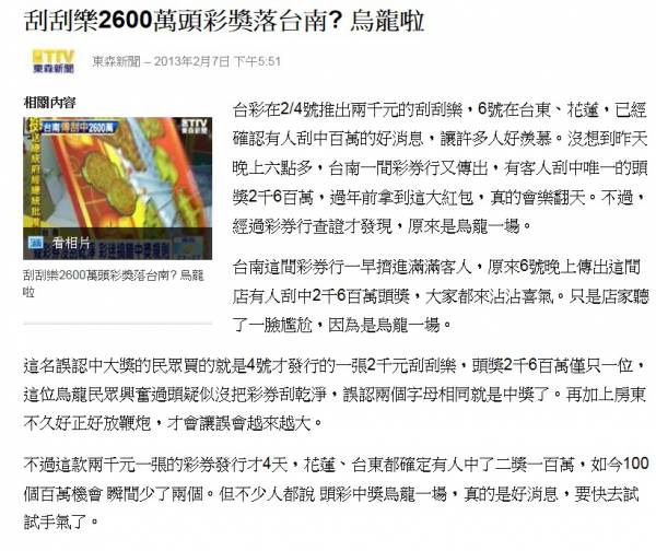 [分享] (02-08) 刮刮樂2600萬頭彩獎落台南? 烏龍啦