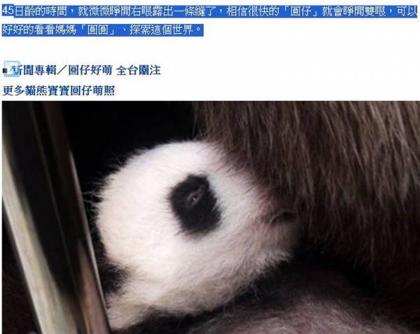 自從出生以來,「圓仔」的成長進度似乎就一直超前,尚未達一般大貓熊幼仔平均開眼天45日齡的時間,就微微睜開右眼露出一條縫了,相信很快的「圓仔」就會睜開雙眼,可以好好的看看媽媽「圓圓」、探索這個世界。