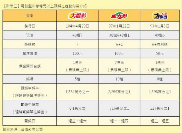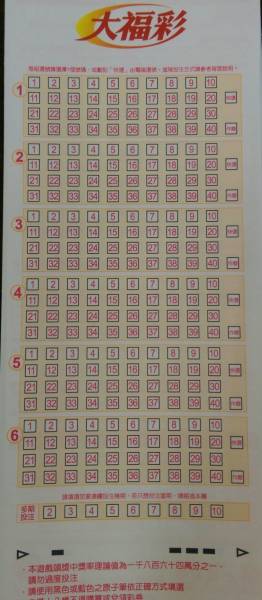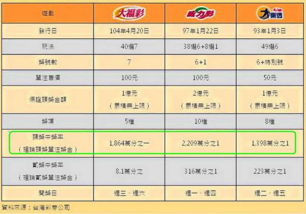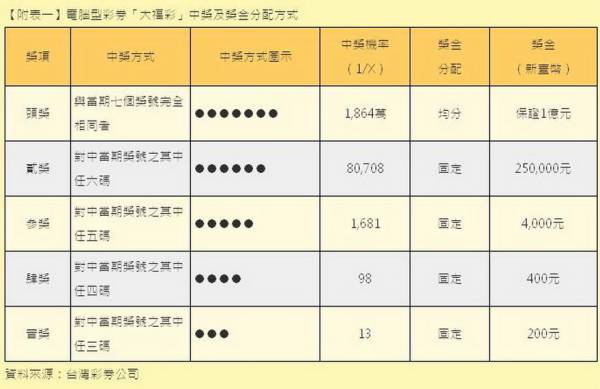 電腦型新遊戲「大福彩」7個號碼全中就中頭獎,頭獎中獎率約為1,864萬分之1,介於大樂透(週二、週五開獎,頭獎中獎率約為1,398萬分之1,頭獎保證1億元)和威力彩(週一、週四開獎,頭獎中獎率約為2,209萬分之1,頭獎保證2億元)之間。「大福彩」上市後,台灣彩券所發行的多樣化產品在每週一至週六,天天都有高頭彩的樂透型遊戲開獎,絕對可以滿足不同消費者的不同需求,歡迎消費者多多買彩券、做公益、積功德,詳見【附表二】。