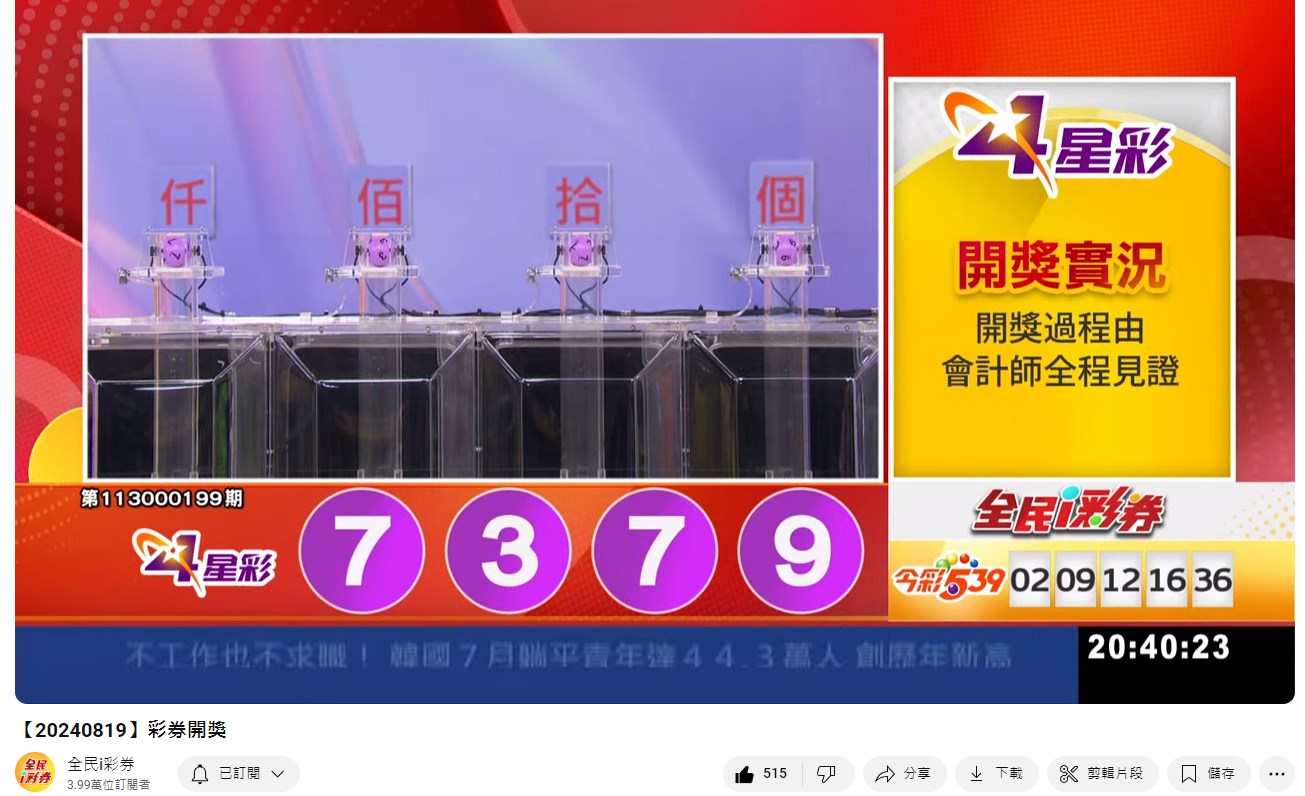 備註: 台彩因給全民兌獎方便,會在電視節目播完後,於全民i彩券YT官方頻道