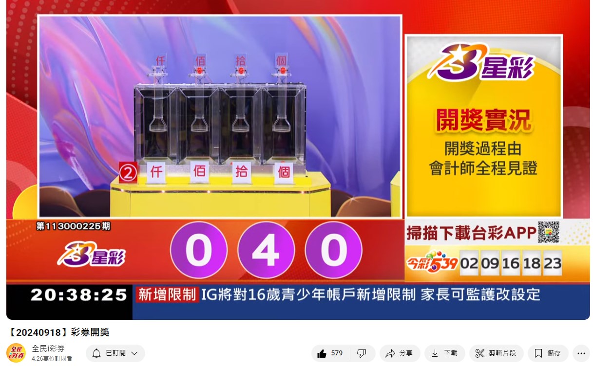 備註: 台彩因給全民兌獎方便,會在電視節目播完後,於全民i彩券YT官方頻道