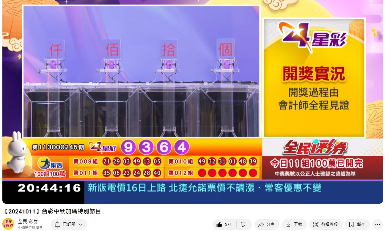 備註: 台彩因給全民兌獎方便,會在電視節目播完後,於全民i彩券YT官方頻道