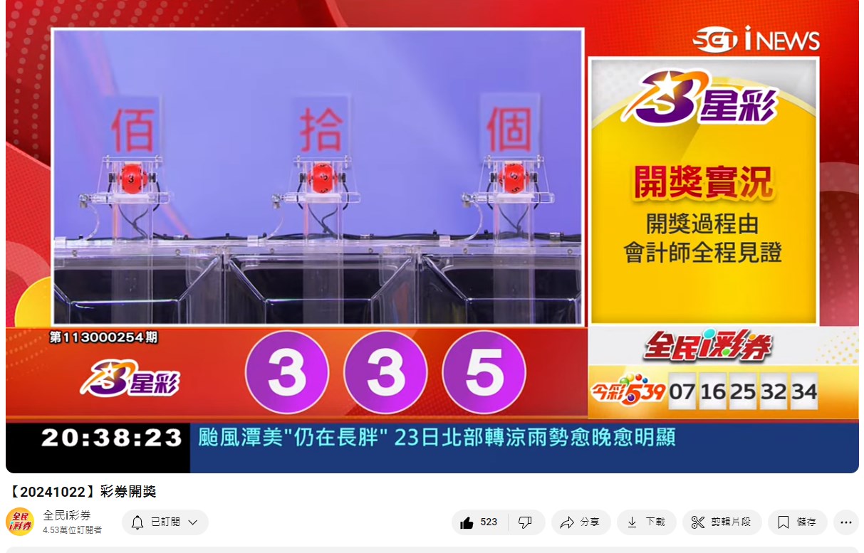 備註: 台彩因給全民兌獎方便,會在電視節目播完後,於全民i彩券YT官方頻道