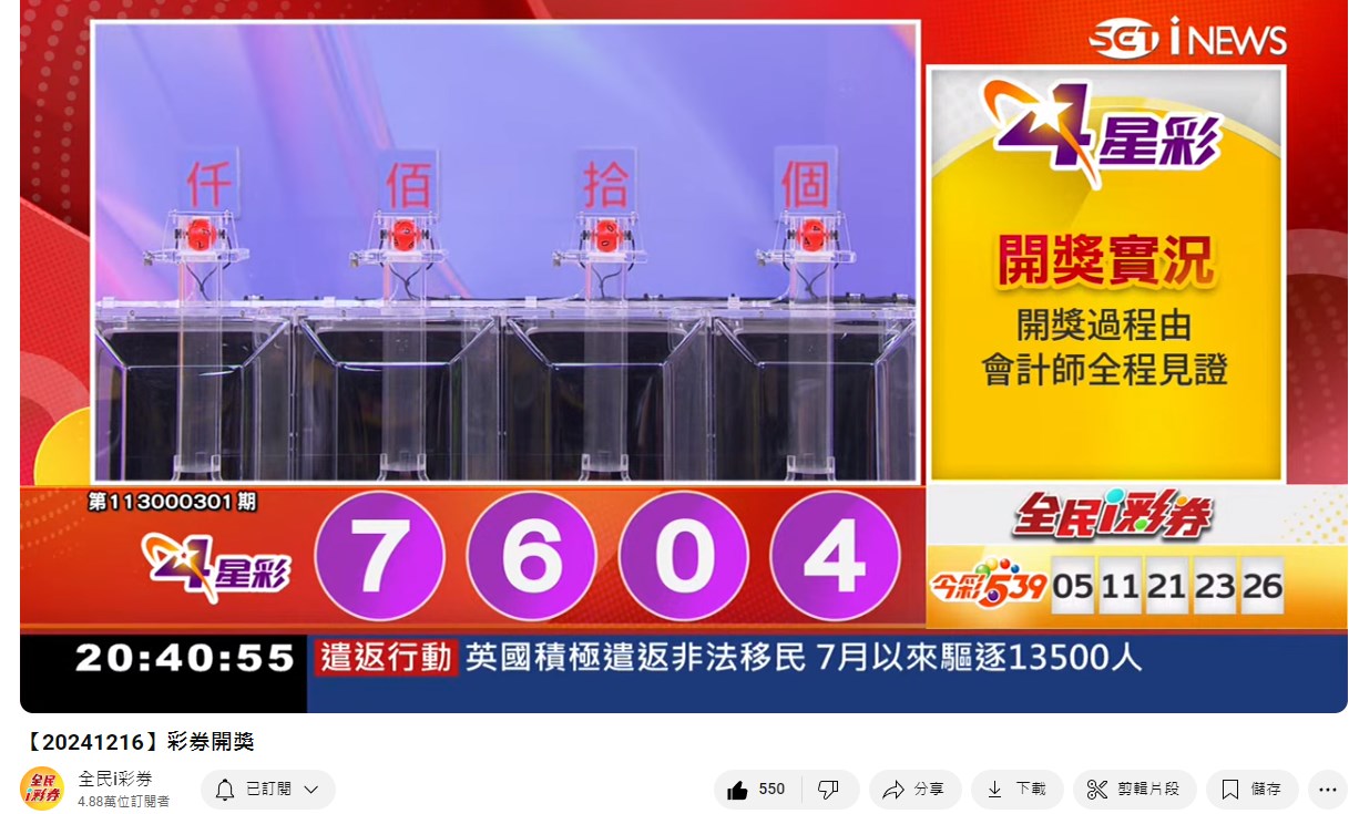 備註: 台彩因給全民兌獎方便,會在電視節目播完後,於全民i彩券YT官方頻道