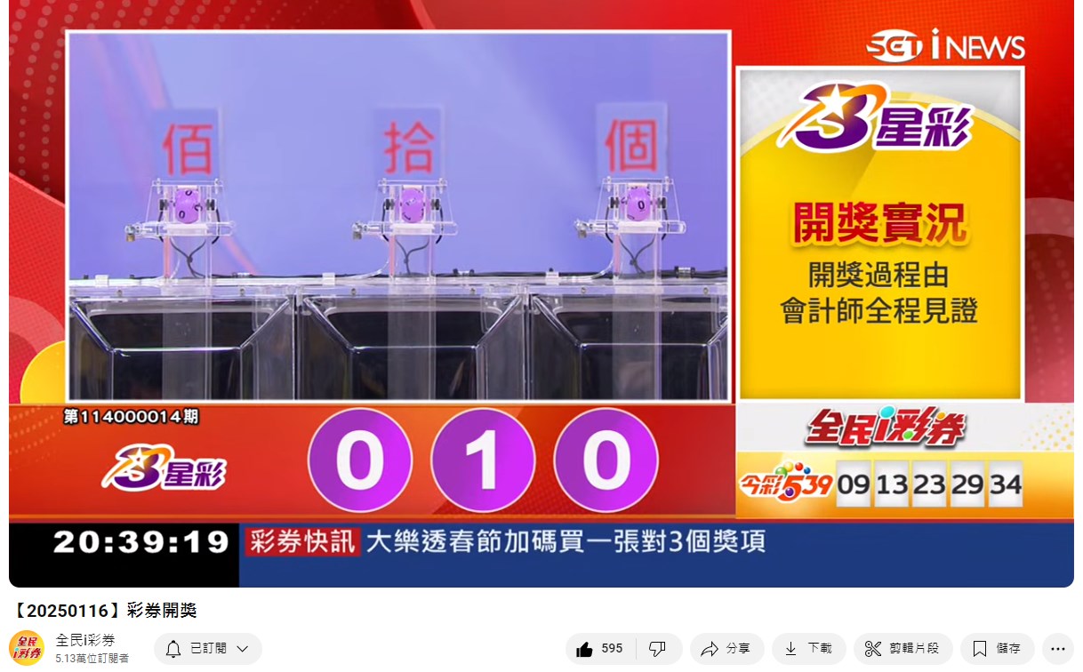 備註: 台彩因給全民兌獎方便,會在電視節目播完後,於全民i彩券YT官方頻道