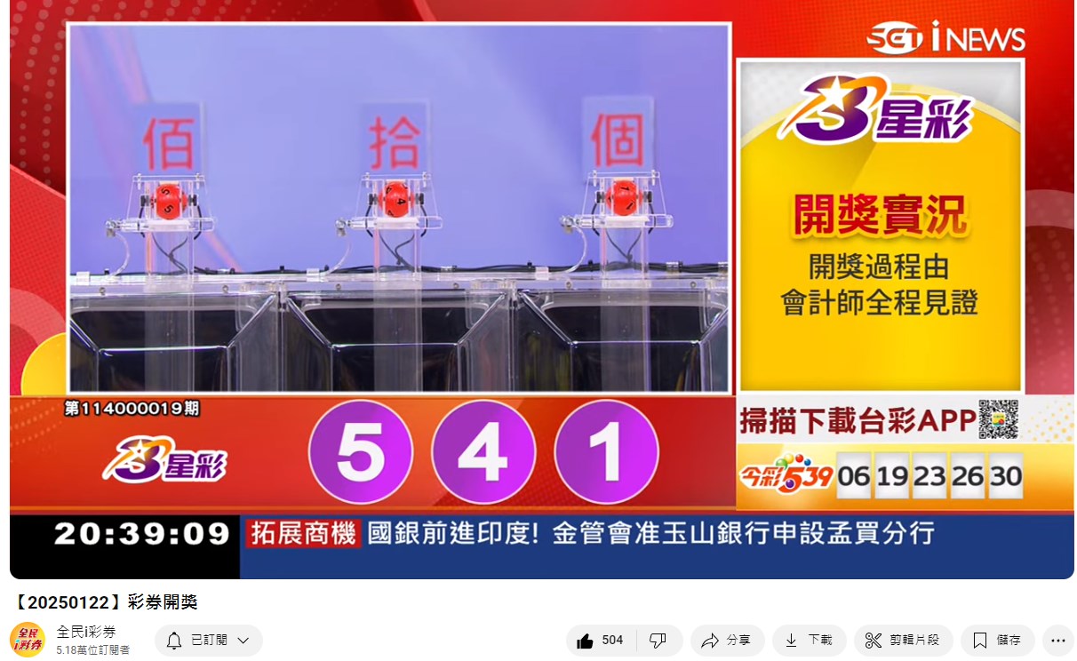 備註: 台彩因給全民兌獎方便,會在電視節目播完後,於全民i彩券YT官方頻道