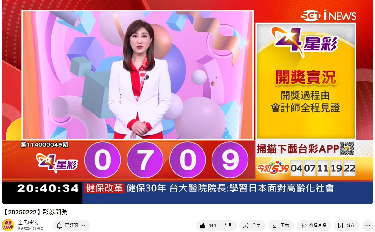 備註: 台彩因給全民兌獎方便,會在電視節目播完後,於全民i彩券YT官方頻道