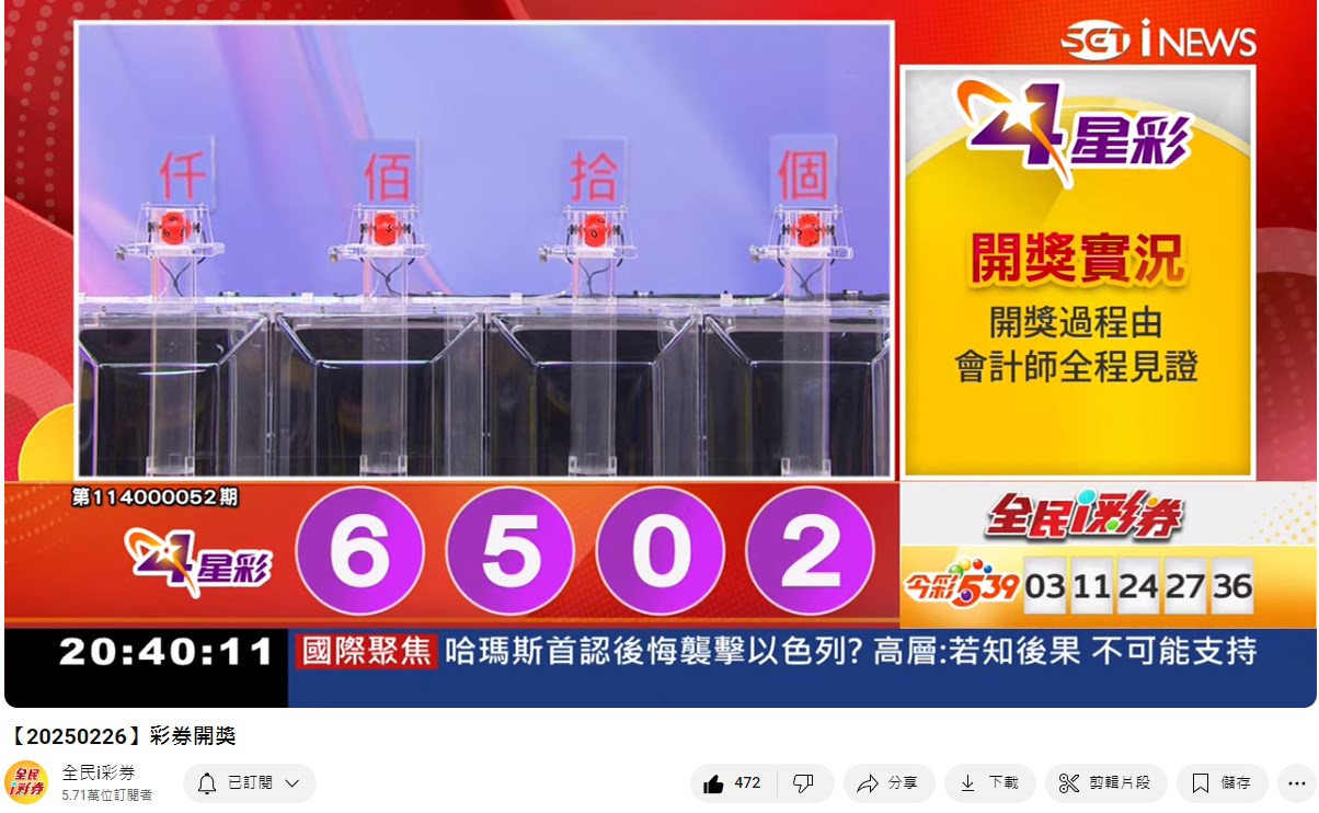 備註: 台彩因給全民兌獎方便,會在電視節目播完後,於全民i彩券YT官方頻道