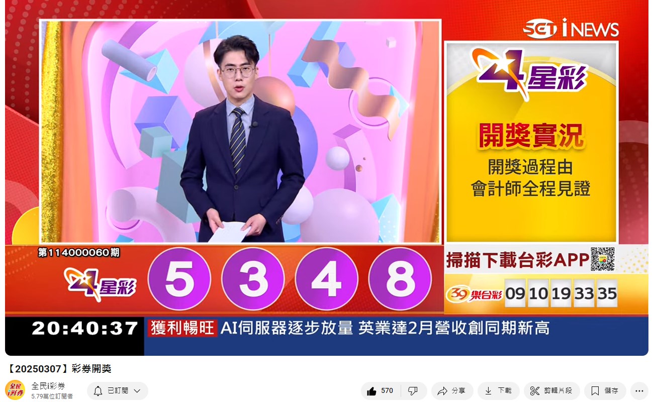 專區【全民i彩券】台灣彩券開獎實況轉播 威力彩、今彩539、三星彩、四星彩 |三立新聞網 SETN.com - YouTube