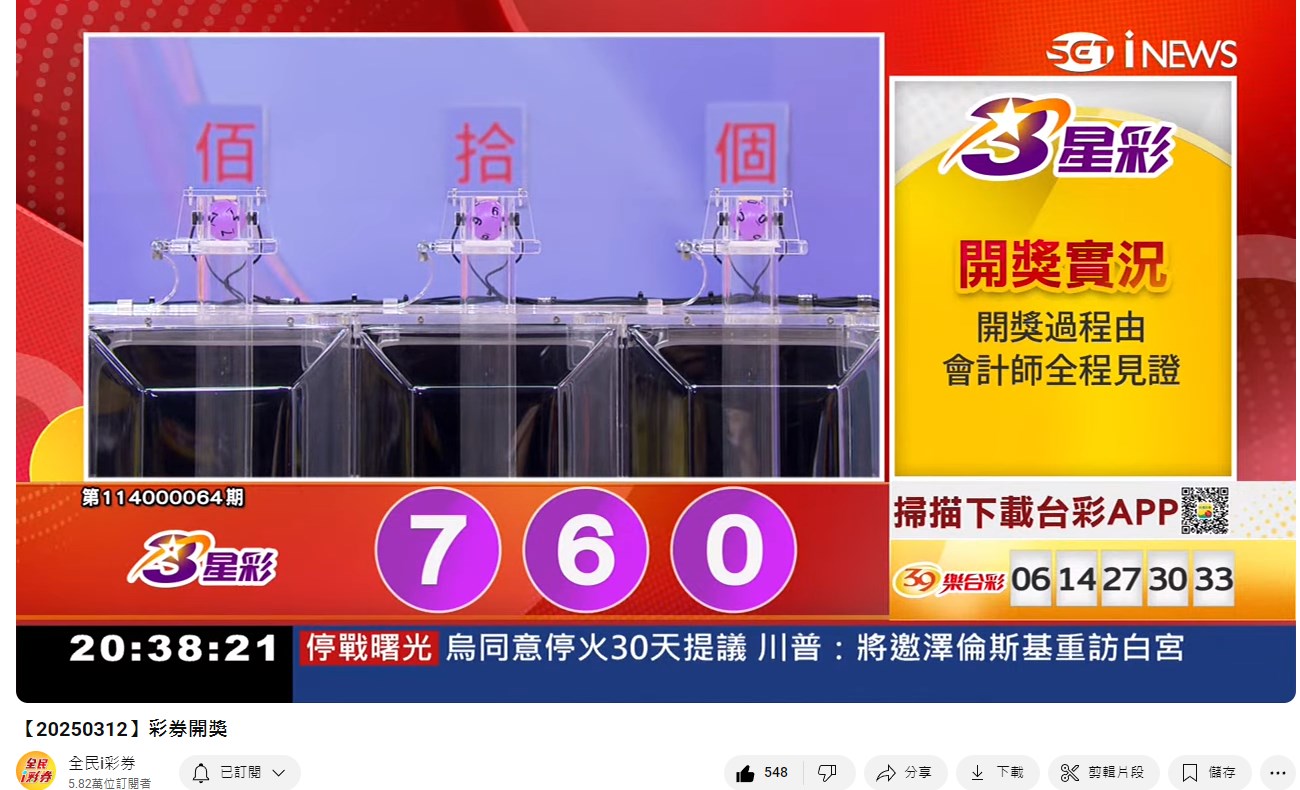 專區【全民i彩券】台灣彩券開獎實況轉播 威力彩、今彩539、三星彩、四星彩 |三立新聞網 SETN.com - YouTube