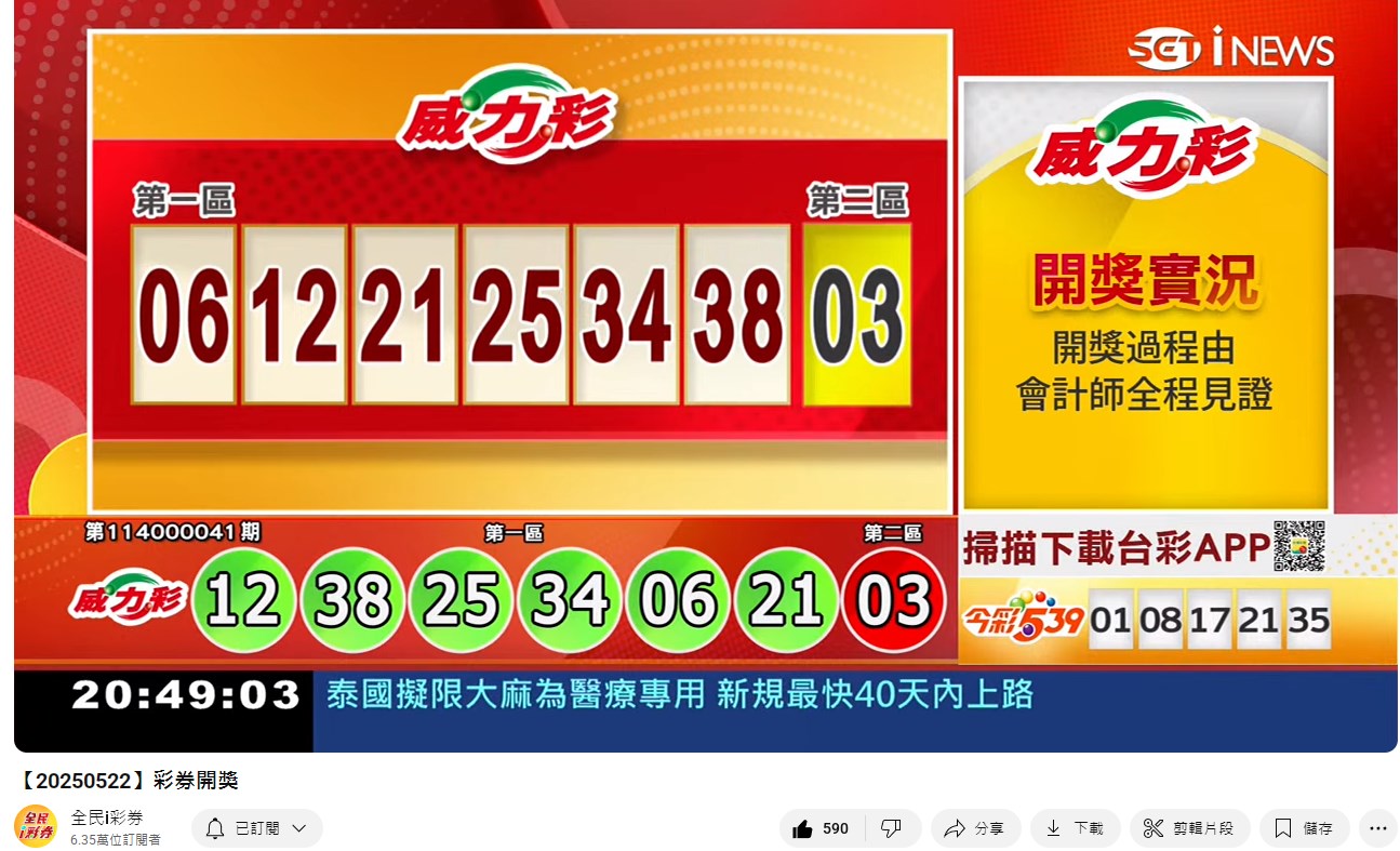 專區【全民i彩券】台灣彩券開獎實況轉播 威力彩、今彩539、三星彩、四星彩 |三立新聞網 SETN.com - YouTube