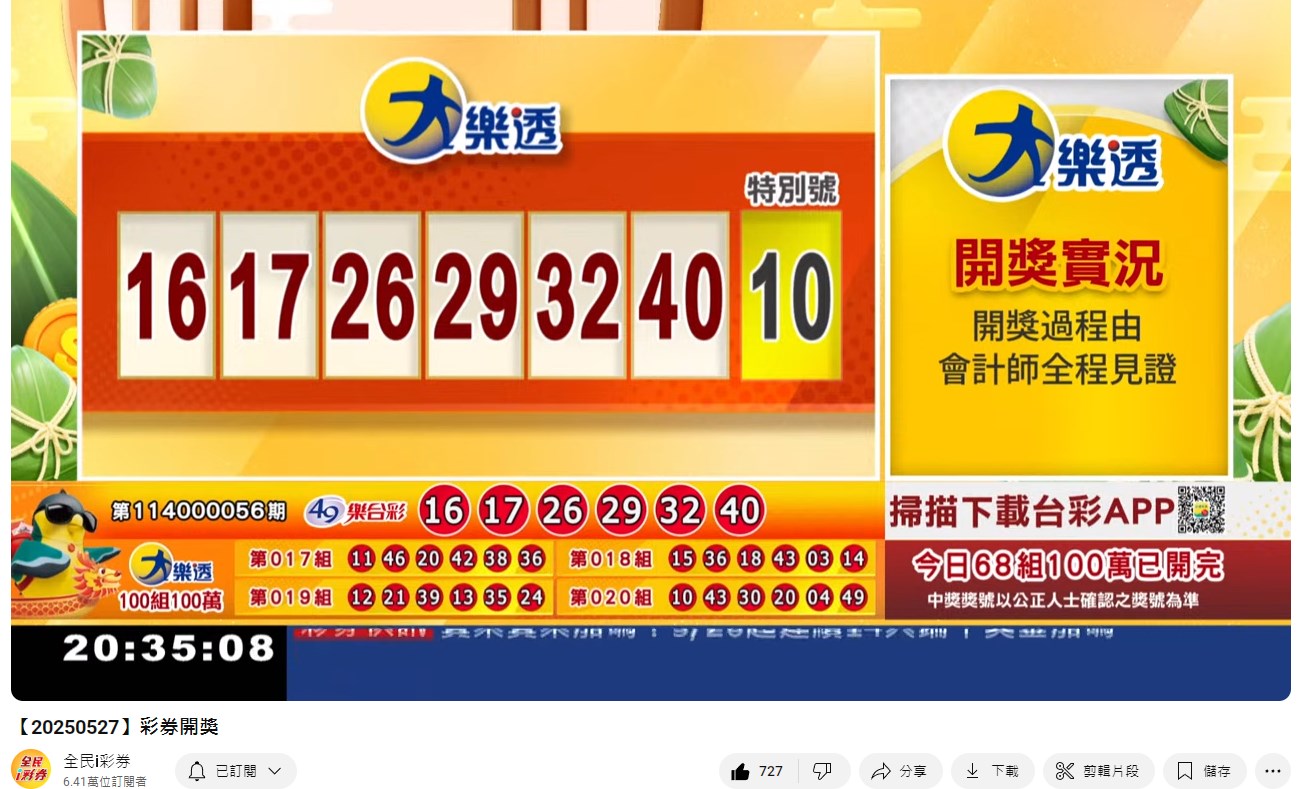 備註: 台彩因給全民兌獎方便,會在電視節目播完後,於全民i彩券YT官方頻道