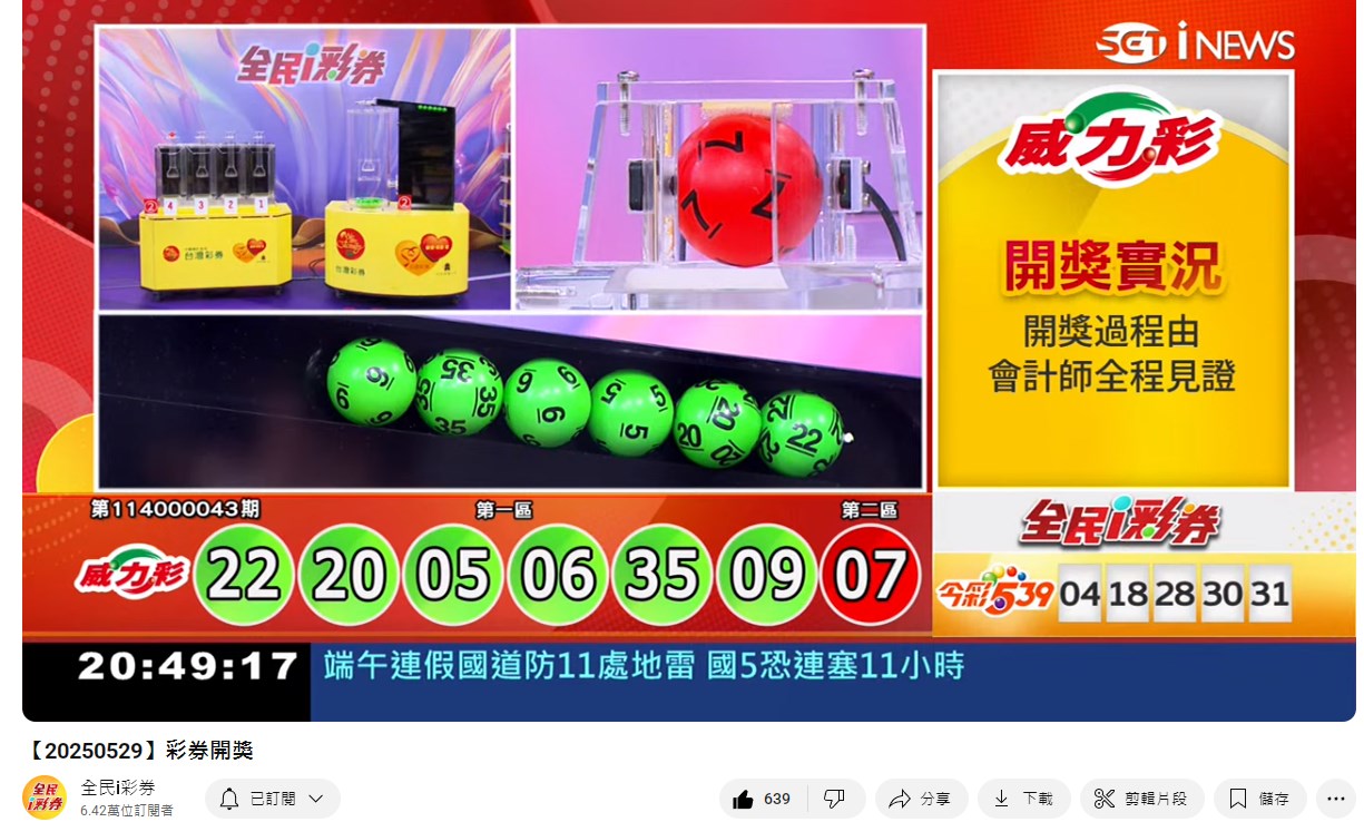 備註: 台彩因給全民兌獎方便,會在電視節目播完後,於全民i彩券YT官方頻道