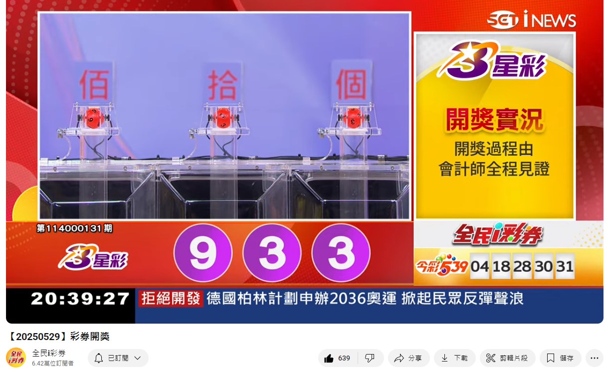 備註: 台彩因給全民兌獎方便,會在電視節目播完後,於全民i彩券YT官方頻道