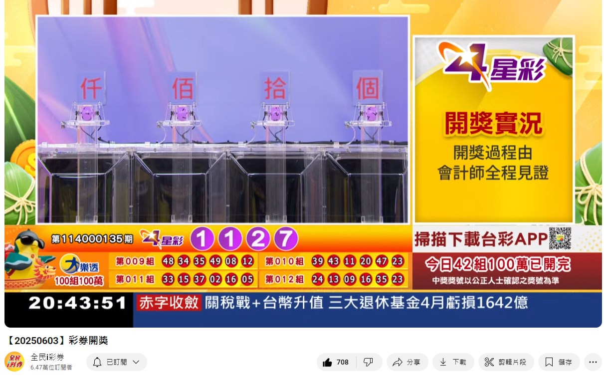 備註: 台彩因給全民兌獎方便,會在電視節目播完後,於全民i彩券YT官方頻道