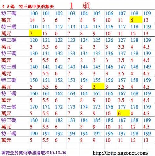 1頭特三尾100~199倍數表!