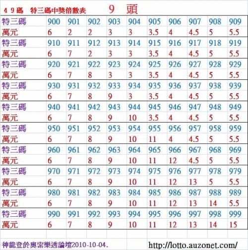 9頭特三尾900~999倍數表!