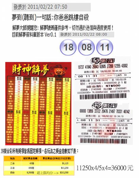 當天早上上網問解夢大師(解夢資料庫),出示三個號碼 08,11,18