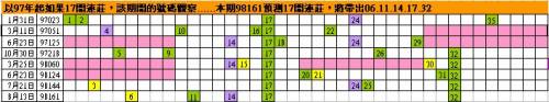 以97年起如果17開連莊,該期開的號碼觀察......本期98161預測17開連莊,將帶出06.11.14.17.32