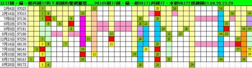 以37開,隔一期再開37的下期開的號碼觀察......98169期37開,隔一期98171再開37,本期98172預測開03.04.20.23.29