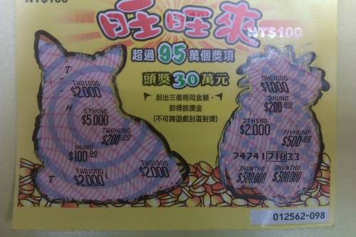 昨天心血來潮好久沒去夾,跑去看看有沒有新的彩券,有ㄧ台像是剛來擺好,不到100元就先夾倒ㄧ張拉斯维加斯(82號),刮出ㄧ個金額地方,就中200元,再往上面比牌地方,自己的牌21點金額200元,再往右邊對數字的又有ㄧ個號瑪根自己相同也是200元 ,最後再來個3個鳳梨200元,整張中800元 再看倒旁邊ㄧ張旺旺來(98號)不囉嗦,10元就掉下來,刮完傻了,中獎金額請看圖